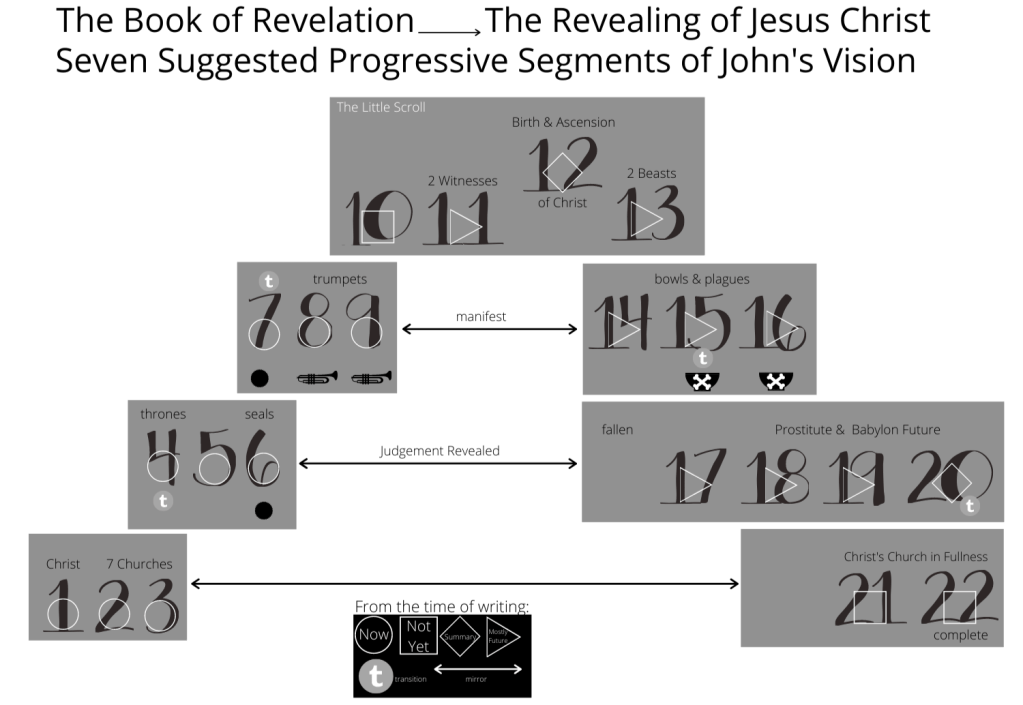 We believe that when the overall Book of Revelation is surveyed, a chiastic structure of repetition and progression is revealed which describes the Gospel Message’s march into the nations of the earth and the conflict that the Kingdom of God endures. A phrase that describes the repetitious progression of the book is “cycular progression.” In the end, Jesus Christ will come for His People.