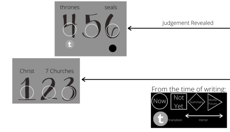 - Chapters 7-9 show ‘now and not yet’ implications of the decree at the time of writing and is themed in terms of the first 6 trumpets.